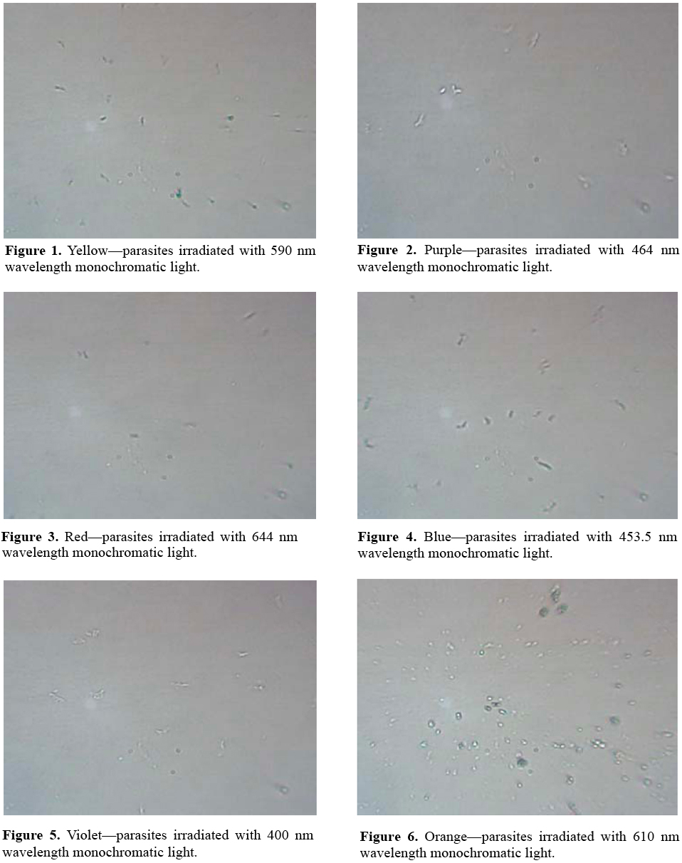 After initial incubation [of Leishmania tropica] for production, out of six samples two were found positive and other four were contaminated with bacteria and fungus. Yellow (590 nm) and purple light (464 nm) increased the size of the parasite (Figures 1 and 2). Red (644 nm), blue (483.5 nm) and violet (400 nm) decreased growth considerably; the size as well as the number of counts of the parasite, with red the most effective (Figures 3-5). Orange colour (610 nm) increased growth incredibly while in green colour (538 nm) the promastigotes appeared to change their size and shape and somewhat converted into rounded form (Figures 5 and 6). In the sample irradiated with red colour wavelength, the parasites were observed as lethargic... as well as least number of counts was observed...