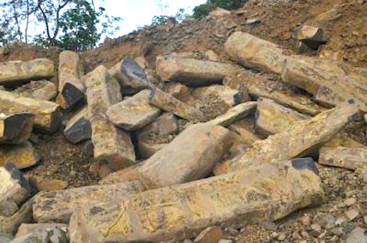 Nangtung Pasanggrahan Hill, West Java, Indonesia (6.8623°S 107.9003°E) is 5,675 miles from the Great Pyramid, comprising 22.80% of Earth's mean circumference. Distinctive man-made orange cement coatings are clearly discernable on all the original cast surfaces of these synthetic megaliths, with the stones' black andesite interior having been exposed along fractured areas where recent damage was incurred during removal by an excavator, parked in the loading area below (below).