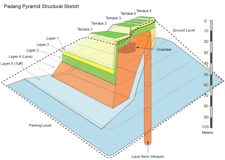 Extensive research conducted at the Padang Pyramid includes dozens of archeological excavations and geophysical surveys applying core drilling, ground penetrating radar, electrical resistivity and seismic tomography to discern internal structural features of the large pyramid. Situated atop an extinct volcano, Padang Pyramid was built using lava as the primary building material that was finely pulverized, mixed with clay, fly ash and water, and cast into giant walled platforms that acted as acoustic resonators.