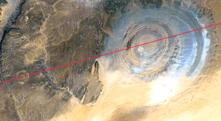 The famous giant concentric sedimentary formation actually has a disregarded twin structure situated to the west of the main structure. This smaller concentric companion feature (above, 21.015°N 11.834°W) is located 2,737 miles from the Great Pyramid, at exactly 11.0%. The two concentric bedrock features are aligned directly with the Great Pyramid, with all three sites falling along a single axis.